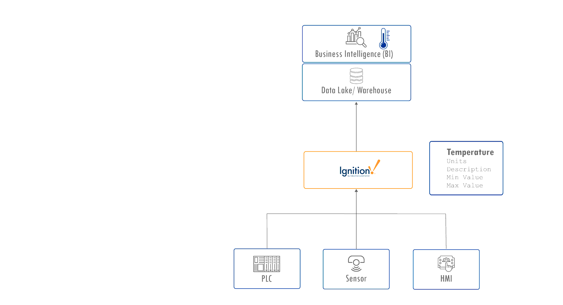 In many Unified Namespace architectures, platforms like Ignition by Inductive Automation serve as industrial data hubs, connecting control systems to enterprise systems such as data lakes and business intelligence tools. You might see a tag like Temperature = 22°C with associated properties such as units, min/max values, or a brief description.