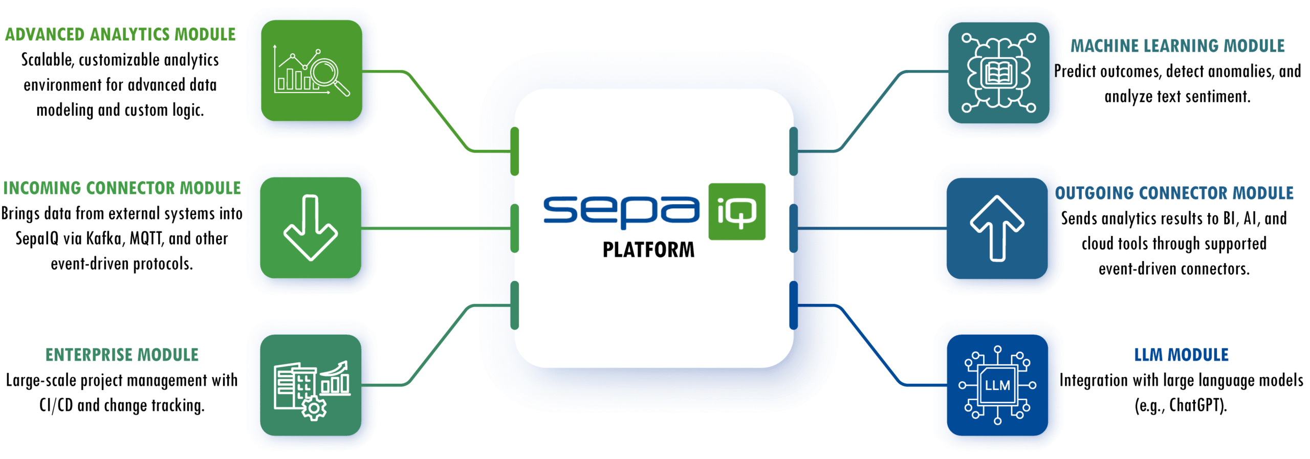 - Connector modules for moving data into and out of SepaIQ